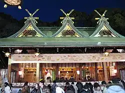 - ↑ Die horizontal endenden Kreuzgiebel weisen darauf hin, dass hier ein weiblicher Gott verehrt wird. Siehe Japanische Schreinarchitektur#Ausschmückung.