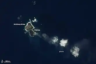 Am 21. November 2013 entstand bei einem unterseeischen Ausbruch rund 200 Meter südsüdöstlich von Nishinoshima eine weitere Insel,[1] mit einer Größe von 300 mal 200 Metern. Die Insel vergrößerte sich durch Eruptionen weiterhin und erreichte Anfang Dezember eine Fläche von 5,6 ha und eine Höhe von 25 m.[2] Bis zum 26. Dezember 2013 nahm die zunächst längliche Insel eine rundere Form an und wies nun Ausmaße von 450 Meter mal 500 Meter auf. Dabei berührte sie an zwei Stellen bereits die Nachbarinsel Nishinoshima und war im Begriff, mit dieser zusammenzuwachsen.[3] Am 7. April 2014 wurde gemeldet, die Inseln seien nunmehr zu einer einzelnen Landmasse vereint.[4] Das Eiland besitzt keinen offiziellen Namen, sondern wird in japanischen Berichten einfach nur „neue Insel“ (新島) genannt, was sich shintō liest bzw. alternativ auch Niijima.[5]
