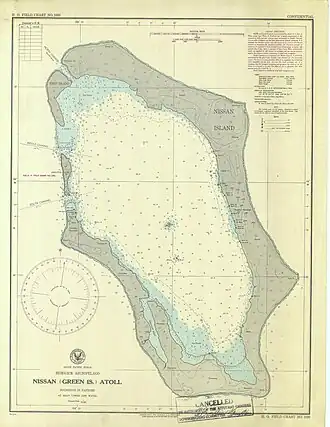 ![]() Nissan ist die große Hauptinsel, im Norden, Osten und Süden des unteren Atolls | ||