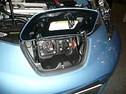 • fünfpoliger Ladeanschluss Typ 1 für einphasige Ladung mit Wechselstrom. Dabei kann in Europa ein Adapter-Ladekabel mit Typ-2-Stecker für Ladung an Typ2-Ladepunkten mit 230 V Wechselstrom einphasig mit 14 A (3,3 kW) bzw. beim 2014er Leaf optional mit 28 A (6,6 kW) oder ein ICCB-Ladekabel 230 Volt Wechselstrom mit maximal 10 A (2,3 kW) mit (an der Haushalt-Steckdose) genutzt werden.[17]