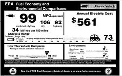 In den USA wird nicht der Kraftstoffverbrauch pro 100 km angegeben, sondern die Reichweite in Meilen pro verbrauchte US-Gallone (ca. 3,8 Liter) Ottokraftstoff. Die Environmental Protection Agency setzt bei Elektrofahrzeugen ein Energie-Äquivalent von 33,7 kWh pro Gallone (8,90 kWh/l) an[28] und nennt die Bezugsgröße „miles per gallon gasoline equivalent (mpge)“ anstatt mpg (miles per gallon). Auf dem für Neuwagen vorgeschriebenen „Monroney-Aufkleber“ an der Scheibe wird eine Reichweite von 106 mpge (2,22 l/100 km) in der Stadt, 92 mpge (2,55 l/100 km) auf Highways und 99 mpge (2,37 l/100 km) kombiniert angegeben.