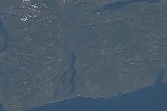 | Ein Bild des Fjords (zentral in der unteren Bildhälfte) aus dem All | ||