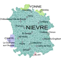 Die Hauptorte des Nivernais sind Nevers, Pouilly-sur-Loire, Cosne-Cours-sur-Loire, Clamecy, Vézelay, Château-Chinon, Decize und Donzy.