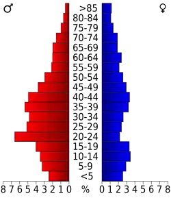 Auf das gesamte County bezogen setzte sich die Bevölkerung zusammen aus 22,6 Prozent Einwohnern unter 18 Jahren, 11,7 Prozent zwischen 18 und 24 Jahren, 31,8 Prozent zwischen 25 und 44 Jahren, 20,8 Prozent zwischen 45 und 64 Jahren und 13,1 Prozent waren 65 Jahre alt oder darüber. Das Durchschnittsalter betrug 36 Jahre. Auf 100 weibliche Personen kamen 130,8 männliche Personen. Auf 100 Frauen im Alter von 18 Jahren oder darüber kamen statistisch 140,5 Männer.