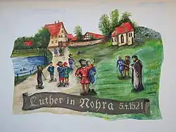 Die Lutherrose im Ortswappen von Nohra erinnert daran, dass Martin Luther sich am 5. April 1521 auf dem Weg zum Reichstag nach Worms im Dorf aufhielt.