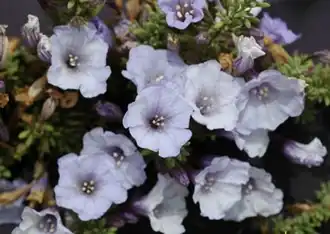 Die Blütenstiele sind 3 bis 8 mm lang und schlank, an der Frucht vergrößern sie sich leicht. Der Kelch ist dicht drüsig behaart, zur Blütezeit 4 mm und an der Frucht etwa 6 bis 7 mm lang. Er ist meist fast bis zur Basis, jedoch immer mindestens bis zur Hälfte gespalten und somit in ungleichmäßige, keilförmige, 2 bis 3 mm lange Zipfel geteilt. Die blaue Krone hat eine Länge von 2,2 bis 2,7 mm, sie ist schwach drüsig und flaumhaarig behaart, vor allem die Innenseite ist feiner flaumhaarig behaart. Die Kronröhre ist 8 bis 10 mm lang und weniger als 1 mm breit. Der Kronschlund erweitert sich plötzlich auf einen Durchmesser von 10 bis 12 (selten auch nur 6) mm. Der daran anschließende Kronsaum misst 18 bis 20 mm im Durchmesser. Die Kronlappen sind abgerundet und aufsteigend. Die Staubfäden sind ungleich lang, linealisch, unbehaart und an der Oberkante der Kronröhre fixiert.