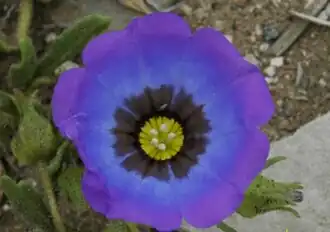 Die Art blüht zwischen Oktober und Dezember. Die Blüten stehen einzeln in den Blattachseln. Die filzig behaarten Blütenstiele sind fadenförmig und 5 bis 6 cm lang. Der Kelch ist glockenförmig, unbehaart, zur Blütezeit etwa 5 bis 6 mm breit. Die Kelchröhre ist etwa 10 mm lang. Die lanzettlichen Kelchzipfel sind 5 bis 7 mm lang und 3 bis 4 mm breit. Die Krone ist auffällig gefärbt und besteht von außen nach innen aus einem violetten, blauen und schwarzen gefärbten Ring sowie einem dunkelgelben Zentrum. Die Krone ist breit trichterförmig bis glockenförmig geformt, 3 bis 4 mm lang und 4 bis 5 mm breit. Die stumpfen Kronlappen sind 2,5 bis 3 mm lang und 9 bis 10 mm breit. Die Außenseite ist mit einreihigen, drüsigen, gestielten Trichomen behaart.
