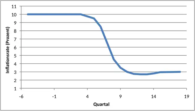 Abbildung 1 zeigt den Verlauf der Inflationsrate unter Berücksichtigung der zeitlichen Staffelung von Lohnkontrakten und somit ohne ein Ansteigen der Arbeitslosigkeit in den Vereinigten Staaten von Amerika. Dabei wird hier berücksichtigt, dass zum Zeitpunkt der Bekanntgabe der politischen Maßnahme nur Lohnkontrakte in Kraft sind, die eine hohe Inflationserwartung aufweisen. Aufgrund dessen ist es notwendig, dass die Zentralbank die Inflationsrate zunächst langsam senkt. Durch Ankündigung der Senkung der Inflationsrate in allmählichen Schritten durch die Zentralbank und entsprechende Durchführung haben die Lohnvertragspartner die Möglichkeit, die sinkende Inflationsrate in ihren zukünftigen Lohnverhandlungen zu berücksichtigen. Erst im weiteren Verlauf darf die Senkung jener einen größeren Wert aufweisen, da erst dann die Mehrheit der Lohnvertragsparteien die niedrigere Inflationsrate in ihren Verträgen berücksichtigt hat.[6]