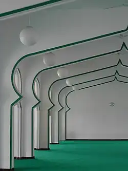 Die in grün und weiß gehaltene Moschee ist zweigeschossig und entstand auf einer Fläche von 720 m². Im Erdgeschoss befinden sich fünf Eingänge, darunter mittig als Hauptzugang ein großes Tor. Im Inneren befindet sich ein von toskanischen Säulen gesäumter Innenhof. Die Säulen tragen Bögen, so dass der Charakter eines antiken Patio entsteht.