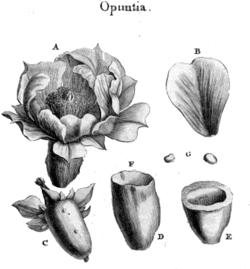 Der Name Opuntia wurde erstmals 1700 von Joseph Pitton de Tournefort für eine Pflanzengattung verwendet. In Institutiones Rei Herbariae führte er nach einer kurzen Gattungsdiagnose insgesamt 11 Arten auf.[21] Als Carl von Linné 1753 für sein Werk Species Plantarum die Kakteengewächse bearbeitete, verwarf er die alten, eingeführten Gattungsbezeichnungen Cereus, Melocactus, Opuntia sowie Pereskia und führte alle Kakteen unter dem Gattungsnamen Cactus, darunter auch die Opuntien Opuntia cochenillifera (Cactus cochenillifer), Opuntia curassavica (Cactus curassavicus), Opuntia ficus-indica (Cactus ficus indica und Cactus opuntia) und Opuntia tuna (Cactus tuna). Nur ein Jahr später führte Philip Miller den Gattungsnamen Opuntia wieder ein.[22] Miller benutzte für seine 14 Arten jedoch noch nicht die von Linné eingeführte binäre Nomenklatur, sondern die davor üblichen beschreibenden lateinischen Phrasen. So wurde Opuntia ficus-indica beispielsweise mit der Phrase Opuntia articulis ovato-oblongis, spinis setaceis (Opuntia mit länglich-ovalen Gliedern und borstigen Dornen) beschrieben. Erst 1768 führte Miller die Binomen in seinem Werk ein.[23]