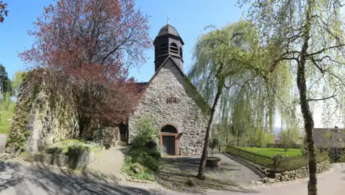 Burgkapelle von Westen. In der Bildmitte der vermutl. auf das Jahr 1100 zurückgehende Gebäudeteil. Zwischen dem alten Teil und der Mauer links, erkennt man eine Erweiterung von 1708 mit separaten Eingang.