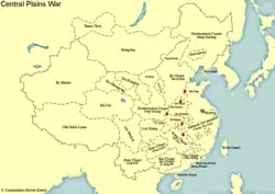 Der besiegte Kriegsherr Zhang Zongchang kehrte 1929 in sein ehemaliges Gebiet Shandong zurück, wo er eine Rebellion gegen seinen ehemaligen Untergebenen Liu Zhennian anzettelte, der während des Nordfeldzugs zu den Nationalisten übergelaufen war. Der Aufstand wurde zwar schnell niedergeschlagen, zeigte aber, dass die Regierung in Nanjing das riesige chinesische Territorium nur schwer unter Kontrolle hatte.[168] Als Chiang versuchte, das Militär zu beschneiden und die Macht der nationalistischen Regierung in Nanjing zu zentralisieren, begannen die regionalen Kriegsherren, deren militärische Kräfte weitgehend intakt waren, ihre Treue zu Chiang aufzukündigen und eine Allianz gegen die KMT zu bilden.[158] Dieser Kampf um die Vorherrschaft mündete in den bewaffneten Auseinandersetzungen des „Kriegs in den Zentralebenen“ von 1929 bis 1930. Obwohl Chiang in diesem Krieg, der seinen Status als einziger Führer ganz Chinas sicherte, letztlich siegreich war, setzten sich Regionalismus und Warlordismus fort, schwächten das Land und legten den Grundstein für den Zweiten Chinesisch-Japanischen Krieg und den chinesischen Bürgerkrieg.[169]