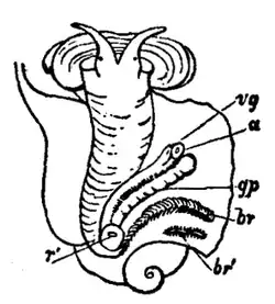 - ↑ Deutsche Übersetzung des Ausdrucks ABO (accessory boring organ) in: Cleveland P. Hickman, Larry S. Robert, Allan Larson, Helen l’Anson, David J. Eisenhour: Zoologie. 13. Auflage, aus dem Englischen von Thomas Lazar. Deutsche Bearbeitung von Wolf-Michael Weber. Pearson Deutschland, München 2008. 1347 Seiten. ISBN 978-3-8273-7265-9, S. 510.