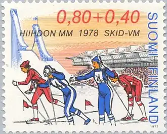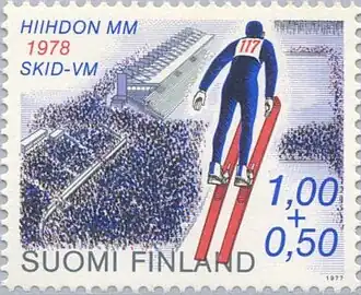 Skispringer bei den Weltmeisterschaften 1978 auf einer finnischen Briefmarke