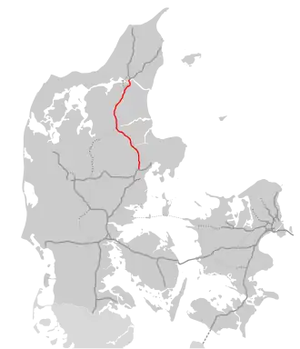 Die Autobahn verläuft in Nord-Süd-Richtung und ist das Verbindungsstück von Østjyske Motorvej im Süden und Frederikshavnmotorvej (Fortführung der E45) sowie Hirtshalsmotorvej (Beginn der E39). Am Nordjyske Motorvej liegen unter anderen die Städte Aalborg und Randers, im Norden von Aarhus befindet sich der Übergang zum Østjyske Motorvej.