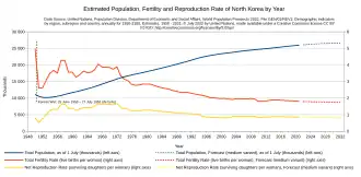Die Bevölkerung Nordkoreas wuchs im Zeitraum von 1960 bis 2016 von 12,3 auf mehr als 25 Millionen Menschen.[26][27] Nordkoreanischen Statistiken zufolge ist die Lebenserwartung seit 1986 im Mittel gesunken. Der offizielle Zensus Nordkoreas vom Jahr 2008 gibt die Lebenserwartung von Männern mit 65,6 Jahren an, die von Frauen mit 72,7 Jahren.[28] Nach Angaben der Vereinten Nationen (UN) betrug die durchschnittliche Lebenserwartung im Zeitraum von 2010 bis 2015 für Männer 67,2 Jahre, für Frauen 74,1 Jahre. Die Lebenserwartung der Einwohner Nordkoreas ab der Geburt lag 2022 lt. Schätzung der Weltbank bei 73,6 Jahren[29] (Frauen: 76,1[30], Männer: 71[31]). Laut Angaben des Zensus Nordkoreas von 2008 lag die Säuglingssterblichkeit bei 1,9 %.[28] Trotz der zahlreichen Probleme und der schlechten Ausstattung des nordkoreanischen Gesundheitswesens ist es gelungen, die Lebenserwartung seit dem Ende des Korea-Kriegs um knapp 30 Jahre zu steigern und die Kindersterblichkeit zu senken.[32] Die Anzahl der Geburten pro Frau lag 2022 lt. Weltbank statistisch bei 1,8, die der Region Ostasien und Ozeanien betrug 1,5.[33] Mit einem Medianalter von 34,2 Jahren und einer Bevölkerungswachstumsrate von jährlich 0,5 % hat Nordkorea eher die demographische Struktur von deutlich höher entwickelten Ländern.[34]