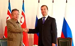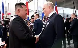 Im Jahr 2011 besuchte Kim Jong-il ein drittes Mal Russland und traf sich mit Putin, wenige Monate vor Kims Tod. Danach übernahm sein Sohn Kim Jong-un die Macht. Im September 2012 erklärte sich Russland bereit, 90 % der historischen Schulden Nordkoreas bei Russland in Höhe von 11 Mrd. US-Dollar zu erlassen als Zeichen einer engeren Zusammenarbeit mit dem neuen nordkoreanischen Staatschef.[11] Mit dieser Vereinbarung wurden rechtliche Hindernisse für die Finanzierung des Handels zwischen den beiden Ländern beseitigt. Der Beginn des Russisch-Ukrainischen Kriegs 2014 führte dazu, dass Nordkorea mit dem sanktionierten Russland sympathisierte und Russland sich außenpolitisch umorientierte.[12] Im April 2019 trafen sich Putin und Kim Jong-un zu Gesprächen beim Nordkorea-Russland-Gipfel 2019 in Wladiwostok, wobei dieser erstmals Russland besuchte, bevor die COVID-19-Pandemie für eine längere Zeit für eine Unterbrechung von persönlichen zwischenstaatlichen Kontakten sorgte.[13][14]