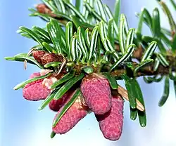 Die Blütezeit liegt im Mai. Die 10 bis 20 Millimeter langen, eiförmigen männlichen Blütenzapfen weisen eine rötlich-braune bis rötlich-gelbe Färbung auf. Sie stehen in den Achseln vorjähriger Nadeln und sind hauptsächlich im unteren Kronenbereich zu finden.