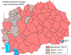 Gemäß den Ergebnissen der nationalen Volkszählung vom September 2021 gibt es neben slawischen Mazedoniern, die 58,44 % der Gesamtbevölkerung stellen, eine große Minderheit an Albanern mit 24,3 %. Von den übrigen Einwohnern sind 3,86 % ethnische Türken, 2,53 % Roma, 1,3 % Serben, 0,87 % Bosniaken und 0,47 % Walachen.[7] Es kommt immer wieder zu ethnisch motivierten Konflikten, vor allem zwischen Mazedoniern und Albanern, doch nach den bürgerkriegsähnlichen Zuständen 2001 und dem danach unterschriebenen Friedensvertrag hat sich die Gesamtlage im Land deutlich verbessert.