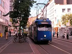 | Blick von der Straßenbahnhaltestelle Dreieck nach Südwesten in die Kreuzung Nordstraße/Goebenstraße/Mauerstraße | |