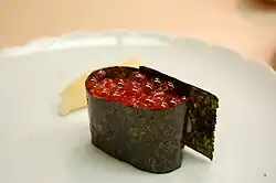 Nori wird überwiegend als Genussmittel verwendet, unter anderem für viele Sushi-Varianten. Es bildet die äußere Schicht von Sushirollen (Maki-Zushi, 巻き寿司) und Schiffchen-Sushi (Gunkan-Zushi). Als Temaki (手巻き) werden Nori-Blätter zu kegelförmigen Tüten gerollt und mit Reis, Gemüse und Fisch gefüllt. Für Nigirizushi (握り寿司), handgeformtes, belegtes Sushi, wird teilweise ein Nori-Streifen verwendet, um den Belag auf dem Sushi „festzubinden“, und beim Onigiri (お握り) ein Nori-Blatt darumgelegt, um das Reisbällchen besser greifen zu können. Reiscracker (Senbei) mit darumgefalteten kleinen Nori-Blättern werden als Snacks gegessen. Mit Sojasauce und süßem Reiswein zu einer dickflüssigen Masse (Nori-Tsukudani) gekocht, dient Nori als würzende, appetitanregende Zutat zu gekochtem Reis; für diese Art der Zubereitung werden meist Monostroma-, nicht Porphyra- oder Pyropia-Arten verwendet.[4] In feine Streifen geschnitten oder zerkrümelt ist Nori auch Bestandteil verschiedener japanischer Gewürzmischungen, die Fischspeisen, Suppen, Salaten und Omeletten einen charakteristischen kräftig-würzigen Geschmack verleihen. Leicht geröstet oder gebacken und anschließend kleingeschnitten findet es auch in Furikake Verwendung – weitere typische Bestandteile solcher Mischungen sind unter anderem gerösteter Sesam und Meersalz – oder wird pur über gekochten Reis oder Nudeln gestreut. Die gleiche Alge ist zerkleinert als Mutachi bekannt.