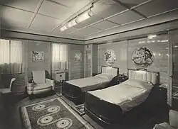 Auch die im Art-déco-Stil gehaltene Innenausstattung der Normandie für insgesamt 1.972 Passagiere war aufsehenerregend, und das Schiff wurde als „imposante schwimmende Bühne des Art déco“ bezeichnet.[6] Die Reederei hatte für die Inneneinrichtung einige der bekanntesten zeitgenössischen Innenarchitekten hinzugezogen, vor allem Roger-Henri Expert, Jean Dunand, René Lalique, Jacques-Émile Ruhlmann, Louie Süe, André Mare, Paul Follot und Raymond Henri Subes. Die Künstler schufen mit Gold und Silber gerahmte Spiegel, und als Wandpaneele dienten Lackarbeiten von Dunand, auf denen afrikanische Fischer, historische Galeeren und Seeungeheuer dargestellt waren.[6]