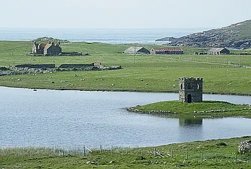 Der Scolpaig Tower aus dem 19. Jahrhundert (auch MacLeod’s Folly) ist ein romantisches Bauwerk auf einer kleinen Insel im See Loch Scolpaig. Es wurde um 1830 von Alasdair (Alexander) "Ban" MacLeod im neogotischen Stil als Arbeitsbeschaffungsprogramm gegen eine Hungersnot in Auftrag gegeben.[2] Der Turm steht auf dem Platz eines eisenzeitlichen Brochs, von dem nichts mehr erhalten ist. Er hat einen achteckigen Grundriss, zwei Etagen und einen Zinnenkranz als Abschluss.[3]