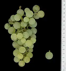 - Die walzenförmige Traube ist mittelgroß, geschultert und dichtbeerig. Die rundlichen Beeren sind klein bis mittelgroß und von grünlicher bis goldgelber Farbe. Die Schale der Beeren ist dünnhäutig und das Aroma der saftigen Beeren neutral.