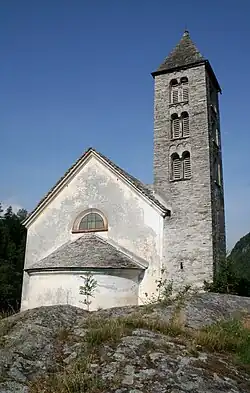 Die Saalkirche mit halbrunder Apsis wurde auf dem Grundriss der alten Vorgängerkirche erbaut. Der Glockenturm stammt aus der Zeit um 1100, der Taufstein in der Apsis aus dem 11. Jahrhundert. Die Kirche schmückt ein Gemälde mit der Darstellung der Verklärung Christi von Melchior Paul von Deschwanden aus dem Jahr 1841, die Glasgemälde stammen von Giovanni Bertini.