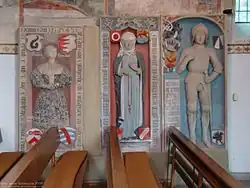 An der Nordwand des Langhauses sind drei schmuckvolle, farbig gefasste mittelalterliche steinerne Grabplatten mit plastischen Darstellungen der Verstorbenen aufgestellt. Die Platten zeigen Anna von Adelsheim († 1543), Magdalena von Bettendorff und einen Herrn Horneck von Hornberg. Auch an den Chorwänden sind historische Grabplatten der Horneck von Hornberg sowie der Herren von Helmstatt und ihrer Gemahlinnen und Kinder aufgestellt. An der Nordwand wurden außerdem historische Wandmalereien freigelegt, darunter abermals Darstellungen der Notburga-Legende und Stifterwappen Horneck/Balzhofen sowie eine historische Ansicht der Kirche.