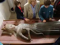 Rechts vom Altar befindet sich die Deckplatte eines historischen steinernen Sarkophags, in dem sich die Gebeine der Ortsheiligen Notburga von Hochhausen befunden haben sollen, die der Legende entsprechend als einarmige Figur plastisch und farbig gefasst abgebildet ist. Über die liegende Figur kriecht eine Schlange, die in der Legende auch eine Rolle spielt.