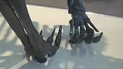 Die Hand umfasste insgesamt fünf Strahlen, Krallen bestanden abweichend von den sehr frühen Faultieren wie Hapalops nur an den Strahlen I bis IV, am fünften waren nur zwei sehr kleine Phalangen ausgebildet. Bei älteren Formen der Nothrotherien wie Mionothropus setzten sich die Strahlen II bis IV, die in der Regel auch die kräftigsten bildeten, aus je drei Fingergliedern zusammen, bei einigen späteren fusionierten die ersten beiden Phalangen des dritten Fingers miteinander, was auch von manchen Megatherien bekannt ist. Bei den Vertretern mit bekanntem Handskelett war die Kralle des zweiten Fingers deutlich abgeplattet. Teilweise bildete der erste Mittelhandknochen gemeinsam mit einigen Elementen der Handwurzel den für verschiedene Faultiere typischen Metacarpal Carpal Complex (MCC). Generell war der erste Finger der kleinste.[17][10][21] Im Gegensatz zur Hand bestand der Fuß aus nur vier Strahlen (II bis V), der innerste war vollständig oder teilweise reduziert. Nur der zweite bis vierte Zeh hatten Krallen ausgebildet, was deutlich von den späten Megatherien abweicht, die nur eine Kralle am Fuß aufwiesen (am dritten Strahl). Bei älteren Faultieren waren noch alle fünf Zehen vorhanden mit Krallen an den Strahlen I bis IV. Die ersten beiden Zehenglieder der dritten Zehe waren bei allen Nothrotherien miteinander verschmolzen. Insgesamt zeigte der Fuß eine deutliche Drehung nach innen, so dass er mit dem äußersten Zeh und dem Fersenbein aufsetzte. Diese als pedolateral bezeichnete Fußhaltung ist typisch für zahlreiche Linien der Bodenfaultiere, kommt bei den heutigen Vertretern aber nicht vor. Im Unterschied zum eher flachen Fuß der Megatherien als nächste Verwandte der Nothrotherien, war der Fuß bei letzteren deutlich aufgewölbt, so dass das Fersenbein nur mit dem Ende den Boden berührte.[22][23][24]