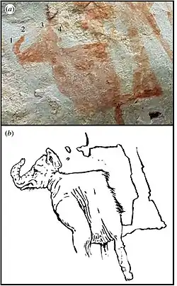 In der Spätphase der stammesgeschichtlichen Entwicklung trat Notiomastodon gemeinsam mit den ersten menschlichen Jäger-und-Sammler-Gruppen in Südamerika auf. Hinweise dafür finden sich unter anderem in einigen Felszeichnungen, die elefantenartige Tiere darstellen. Große Bedeutung hat hierbei Serranía La Lindosa, ein rund 20 km² großes felsiges Gebiet im zentralen Kolumbien. Die in rot gehaltenen Malereien, deren Alter bei rund 12.600 bis 11.800 Jahre vor heute liegt, zeigen verschiedene Vertreter der ehemaligen Großtierfauna Südamerikas, darunter riesige Faultiere, Südamerikanische Huftiere, Pferde und Kamele. Eine Darstellung scheint ein Tier mit aufragendem Rüssel, aufgestellten Ohren und einem relativ flach aufgewölbten Kopf zu repräsentieren. Hierbei könnte es sich durchaus um eine Wiedergabe von Notiomastodon handeln, das nach heutiger Auffassung damals das einzige Rüsseltier in den Tiefländern Südamerikas war.[67][68]