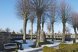 Um die Kirche herum befindet sich der Friedhof. An seiner Westseite gibt es eine halbkreisförmige Gedenkmauer (1921/1922), in der jeder der 41 Gefallenen des Ersten Weltkriegs eine eigene Tafel mit seinem Namen erhalten hat. Im Zentrum des Halbkreises steht ein 2 m hoher Findling, der auf Dänisch die Inschrift trägt: „Dieses Andenken errichtete die Gemeinde Notmark für ihre Söhne, die ihr Leben im Weltkrieg 1914–1918 opferten“.[23] Auf der Nordseite des Friedhofs liegt das Grab des Mundartdichters Martin N. Hansen.[24]