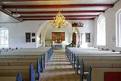 Im Chor finden sich Kalkmalereien von 1564, die 1907 durch unsachgemäßes Nachmalen des Schleswiger Kunstmalers und Restaurators Hans Hampke ihr originales Gepräge verloren.[11] Daher wurden 1962 die florale Ornamentik und eine Szene mit dem Weltgericht weiß übermalt und nur die Wappen von Thomas Sture und seiner Frau in der Chorwölbung wurden belassen.[12] An der nördlichen Chorwand hängen ein Chorbogenkruzifix von ca. 1525 und ein Barockepitaph des Amtmanns Johan Franz von Aichelberg von 1697, dessen Gemälde die Auferstehung des Volkes Israel nach Hesekiel 37 zeigt.[13][14]