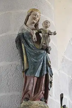 - Die farbig gefasste Holzskulptur der Madonna mit Kind ist eine Arbeit aus dem 14. Jahrhundert. Maria hält das Jesuskind auf dem Arm, das mit ihrem Schleier spielt und seinen linken Fuß nach hinten dreht.[5]