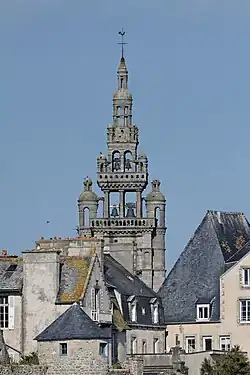 Der Glockenturm wird auf beiden Seiten von schlanken Rundtürmen flankiert und besitzt zwei von Balustraden umgebene Glockengeschosse, die von zwei übereinanderliegenden Laternen bekrönt werden. Das Portal der westlichen Vorhalle wird von spitzbogigen Archivolten gerahmt, die mit Krabben besetzt sind. Auf dem Schlussstein des Rippengewölbes der Vorhalle sieht man einen Engel mit den Wappen Frankreichs und der Bretagne, der Lilie und dem Hermelin. Der Raum über dieser Vorhalle wurde früher für Ratsversammlungen genutzt.