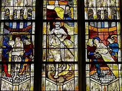 ![]() Das Georgsfenster wurde vermutlich zwischen 1481 und 1483 geschaffen. Damals war der französische König Ludwig XI. Grundherr von La Ferté-Bernard. An ihn und seine Gemahlin Charlotte von Savoyen erinnern die beiden Wappen in den Spitzen der rechten und linken Lanzette. Beide sind auch in der mittleren Lanzette über dem heiligen Georg, der den Drachen besiegt, dargestellt. Die seitlichen Lanzetten schildern Szenen seines Martyriums.[21] |
