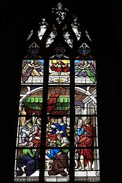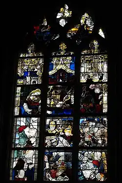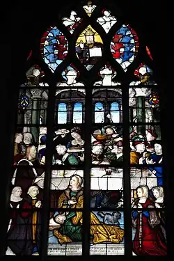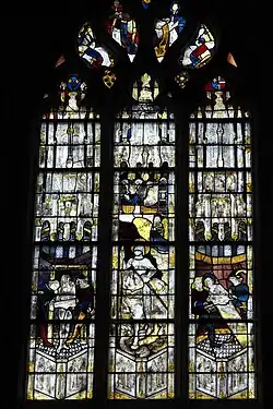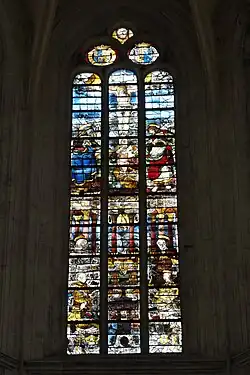 ![]() Das Fenster wurde in der zweiten Hälfte des 19. Jahrhunderts neu zusammengesetzt. Im Zentrum ist die Auferweckung des Lazarus dargestellt. Die Szene wurde vermutlich im frühen 16. Jahrhundert von Robert Courtois geschaffen. Andere Szenen stellen die Kreuztragung, die Kreuzigung, die Kreuzabnahme und die Auferstehung Christi dar. Auf der mittleren Scheibe der linken Lanzette kann man Jesus vor Pilatus erkennen.[15] |