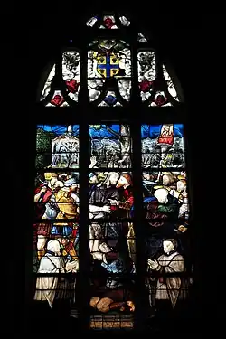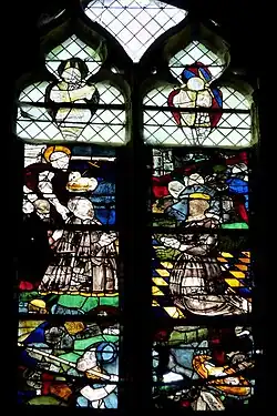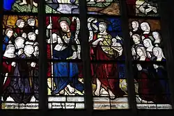 ![]() Auf einem Fenster ist die Belagerung von La Ferté-Bernard durch englische Truppen während des Hundertjährigen Krieges dargestellt, die nach dem damaligen Glauben durch die Hilfe der Jungfrau Maria beendet werden konnte. Bereits Ende des 15. Jahrhunderts stifteten die Bewohner von La Ferté-Bernard aus Dankbarkeit ein Fenster zu diesem Ereignis, von dem heute nur noch das Maßwerk erhalten ist. Im Jahr 1877 erhielt Eugène Hucher den Auftrag, das Fenster wieder zu vervollständigen.[25] |