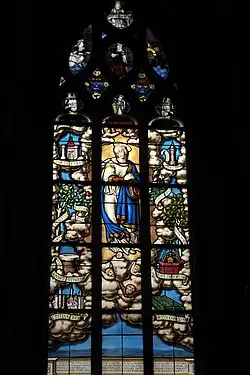 ![]() Das Fenster wurde von Léopold Charles stark restauriert und ergänzt. Die untere Inschrift besagt, dass das Fenster 1533 gestiftet und 1858 restauriert wurde. Im Maßwerk ist Gottvater dargestellt, unten die Stifter, über denen die Stadt La Ferté-Bernard mit ihrer Kirche zu erkennen ist. Die Mariensymbole sind von Schriftbändern mit ihren lateinischen Bezeichnungen wie „DOMUS DEI“ (Haus Gottes), „TURRIS DAVID“ (Turm Davids), „SPECULUM SINE MACULA“ (Spiegel ohne Makel), „PORTA CELI“ (Pforte des Himmels), „HORTUS CONCLUSUS“ (verschlossener Garten) umgeben.[8] |