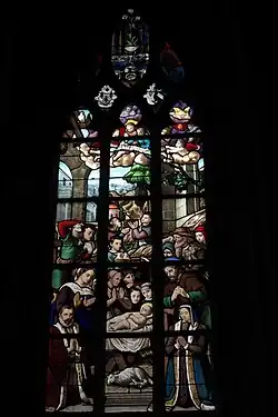 ![]() Das Fenster wurde um 1534 von der Familie Heullant bei dem Glasmaler Jean Courtois aus La Ferté-Bernard in Auftrag gegeben. Auch hier sind nur noch die oberen Teile der Lanzetten und das Maßwerk von der ursprünglichen Verglasung erhalten. Im Jahr 1868 wurden neue Scheiben mit der Darstellung der Geburt Christi eingesetzt, die vermutlich von Eugène Hucher in der Glasmalereiwerkstatt der Karmelitinnen von Le Mans hergestellt wurden.[6] |