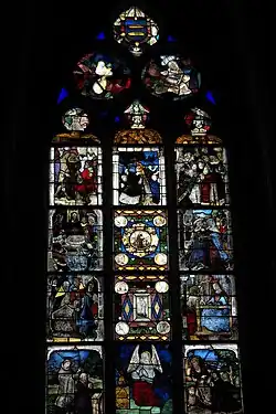 ![]() Das Fenster wurde von François de Lorraine, dem Herzog von Guise, und seiner Gemahlin Anna d’Este in Auftrag gegeben und um 1600 ausgeführt. Die Stifter sind auf den unteren Scheiben dargestellt, hinter ihnen ihre Schutzpatrone, der heilige Franz von Assisi und die heilige Anna. Ihre Wappen, die von der Kette des Ordens des heiligen Michael umrahmt werden, sieht man im Maßwerk. Die mittlere Lanzette zeigt Christus am Kreuz, zu dessen Füßen Maria Magdalena kauert. Auf der linken Lanzette sieht man Maria und auf der rechten Lanzette den Apostel Johannes.[22] |