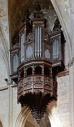 Die Orgel wurde 1501 in der Orgelmanufaktur von Evrard Baudot in Auftrag gegeben und ist als Schwalbennestorgel ausgeführt. Vom ursprünglichen Gehäuse sind nur noch die Konsole und die korbförmige Empore erhalten. Der obere Teil wurde erneuert.[27]