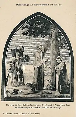Der Legende nach sahen Hirten in einem Moor Tauben um eine Eiche flattern. Abends soll die Baumkrone wie von einem Feuerschein geleuchtet haben. Als der damalige Pfarrer der Pfarrei Vion, James Buret, 1494 von den Vorfällen erfuhr, dachte er sogleich an die Heilige Jungfrau und setzte eine Tonfigur in den Stamm der Eiche. Es entwickelte sich eine Pilgertätigkeit und verschiedene Wunder und Heilungen wurden dokumentiert. 1515 entstand ein Oratorium, das 1625 ausgebaut wurde.[2] Die Pilgerzahl wuchs im 19. Jahrhundert auf 60.000 pro Jahr.[3]