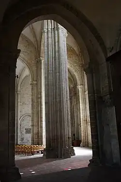 Der Wandaufriss von Mittelschiff und Chor ist zweigeschossig. Über weiten, spitzbogigen Arkaden öffnen sich die Obergadenfenster, die in späterer Zeit vergrößert wurden. In den Seitenschiffen sind die Kreuzgratgewölbe aus dem 12. Jahrhundert erhalten, im Hauptschiff wurden sie im 19. Jahrhundert erneuert. Die Kapitelle der Säulen sind mit Flachreliefs skulptiert, auf denen Blattranken, menschliche Figuren und Fratzenköpfe dargestellt sind. Die Basen der Säulen sind mit Eckblättern in Form von Tier- und Menschenköpfen geschmückt. Der Chor besitzt noch sein ursprüngliches Kreuzrippengewölbe. Die Schlusssteine der Chorseitenschiffe sind mit Skulpturen von Engeln und gekrönten Personen verziert.
