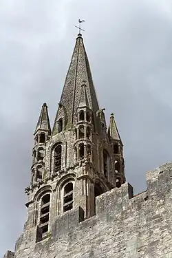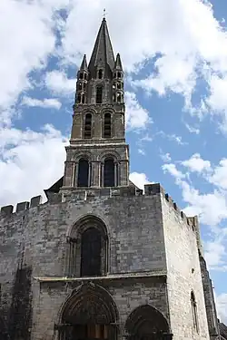 Aufgrund der unterschiedlichen Bauphasen und nachträglichen Erweiterungen weist die Kirche einen unregelmäßigen Grundriss auf. Hinter der Westfassade erhebt sich über einer Vorhalle der Glockenturm, der im 12. Jahrhundert in drei Bauphasen errichtet wurde. Die beiden unteren, quadratischen Stockwerke sind von großen, rundbogigen Zwillingsarkaden durchbrochen. Das dritte Geschoss ist achteckig und wird nach unten durch ein auf Kragsteinen aufliegendes Kranzgesims abgegrenzt. An seinen vier Ecken stehen kleine, von offenen, in drei Reihen übereinanderliegenden Arkaden durchbrochene Rundtürme mit hohen Spitzen. Auf dem Oktogon sitzt die achtseitige, steinerne Turmspitze, die mit Schuppenornamenten verziert ist.