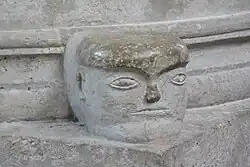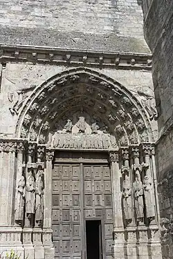 Auf dem Türsturz sind 14 Personen dargestellt, in der Mitte die zwölf Apostel und zwei weitere Personen außen, die als Maria und Johannes der Täufer oder als der Prophet Elias und Henoch gedeutet werden. Das Tympanon zeigt Christus, der zwischen zwei Engeln zum Himmel auffährt. An den Archivolten sind 36 Personen vertreten, die auf Thronen sitzen und Musikinstrumente oder Spruchbänder in den Händen halten.
