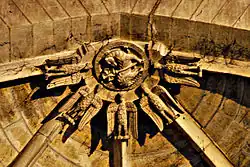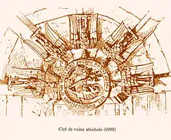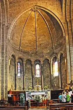 Die Apsis wird überdeckt von einer sauber ausgerundeten halben Kuppelkalotte die von drei Rundprofilen in keilförmige gewölbte Abschnitte unterteilt. Die Begrenzung der Kalotte übernehmen hinter dem Keilsteinbogen des Triumphbogens zurückversetzte Vierkantprofile. Alle Profile stehen auf Basen und kleinen Kapitellen in Höhe der Gewölbeansätze. Im Gewölbescheitel stoßen sie auf einen nicht vollständigen steinernen Kreisring, der unterseitig ganz besonders aufwändig dekoriert ist. Die innere Öffnung des Kreisrings wird umschlossen von einem schmalen Kreisring, den rundum eine lateinische Inschrift ziert. Im Kreis ist die rechte Körperseite eines Lamm Gottes zu sehen, das seinen Kopf nach hinten gedreht hat. Unter seinem Körper biegt sich eine Stange hinauf, die ein Tatzenkreuz bekrönt. Um den Steinkreis herum breiten sich strahlenförmig fünf Adler mit ausgebreiteten Flügeln aus, deren Köpfe auf dem Steinring aufliegen. Die Skulpturen der Adler und des Lamm Gottes im Kreisring scheinen aus Metall zu bestehen.