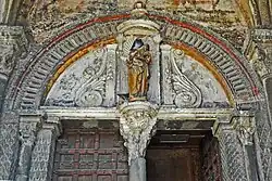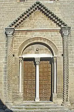 In der Fassadenmitte öffnet sich vier Stufen über dem Bodenniveau das große rechteckige Westportal mit einer zweiflügeligen Tür. Es wird umschlossen von einer Archivolte, die allseitig in Wandrückversätze eingelassen ist. Diese besteht seitlich aus sehr schlanken leicht nach oben konisch zulaufenden weißen Säulen, die mit floral skulptierten Kapitellen, hohen profilierten Kämpfern und Basen ausgestattet sind. Die sehr hohen scharfkantigen Sockel unter den Basen deuten auf eine Wiederverwendung der Säulen hin. Hinter den Säulen treten seitlich in die Türöffnung Wandstreifen hervor deren schmale Sichtseiten mit pflanzlichen Ornamenten dekoriert und deren Laibungsseite mit senkrechten Rillen profiliert sind. Das Kämpferprofil über den Kapitellen setzt sich auch darüber fort. In der Mitte der Türöffnung wurde eine weitere weiße Säule freistehend und ebenso zurücktretend installiert, deutlich dicker und länger als die seitlichen aber ähnlich ausgerüstet. Das Kapitel weist pflanzliche Skulptur auf, wie auch die von Masken. Auf den Kämpfern der Türlaibungen und der Mittelsäule liegt ein ebenfalls weißer und relativ schmaler Sturzbalken auf. Dieser trägt oberflächenbündig ein glatt gemauertes halbrundes Bogenfeld. Das wird wandbündig vortretend vom Archivoltenbogen überfangen, der auf beiden Seiten auf den Kämpfern der seitlichen Kapitelle aufsteht. Seine Außenseite ist mit einem kleinen länglichen floralen Motiv, das sich in kurzen Abständen wiederholt, strahlenförmig dekoriert. Dieser Schmuckstreifen wird beidseitig von schlanken Profilen begleitet.